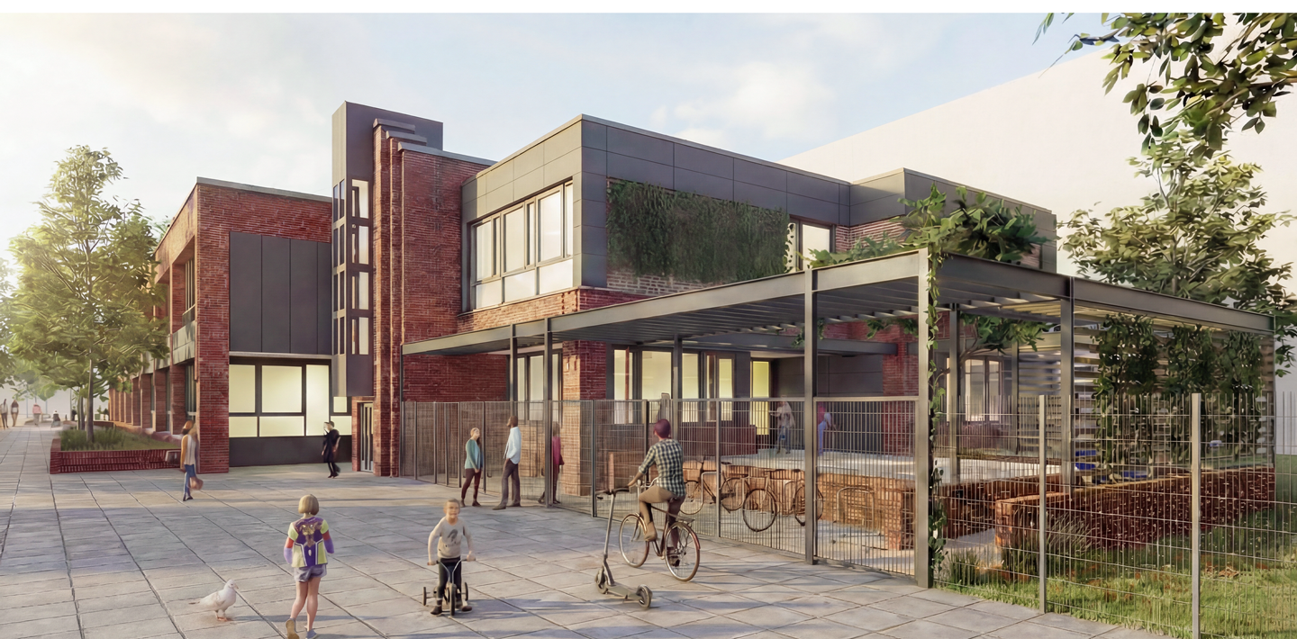 Im Rahmen der Sanierung wurden die Räume auf der Südseite des Erdgeschosses vollständig entkernt und neu geplant, sodass vier großzügige Unterrichtsräume entstanden, die helle, gut nutzbare Räume und eine angenehme Lernumgebung den Schüler*innen bieten. Weitere Maßnahmen umfassten die Anpassung der Grundrissstruktur an die schulische Nutzung, brandschutztechnische Maßnahmen, die Sanierung von Dach, Kellerdecke und Gründach sowie die Erneuerung der Haustechnik.