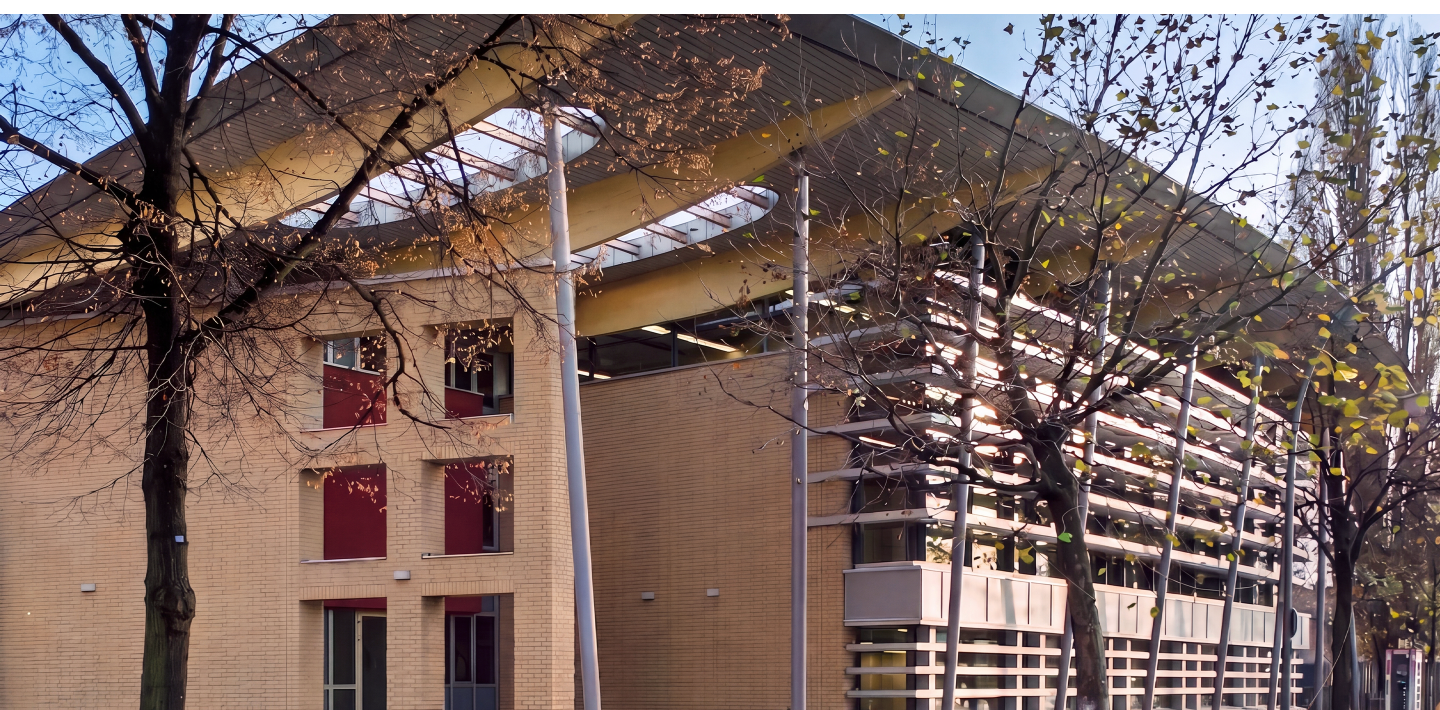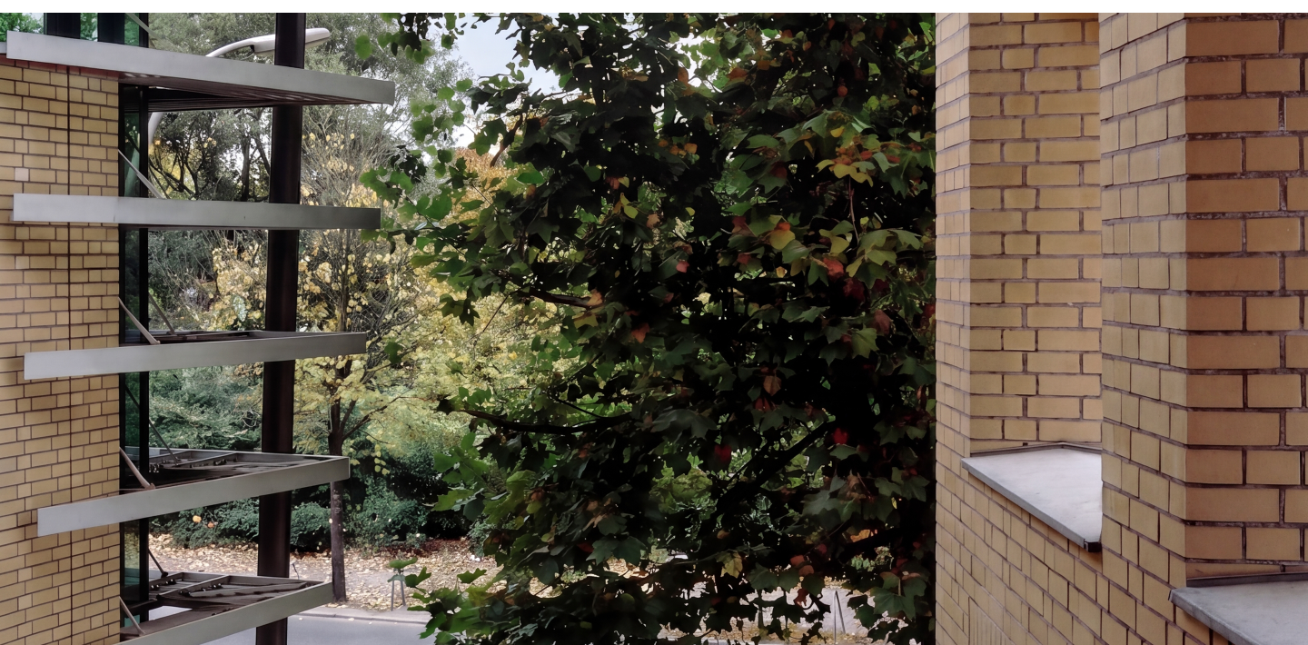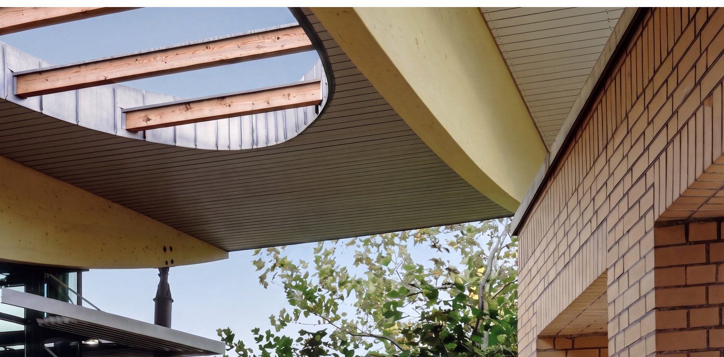 Um das denkmalgeschützte Schulgebäude nicht zu überragen, wurde die untere Halle um ein Geschoss abgesenkt. So fügt sich der Neubau trotz seiner Größe zurückhaltend in das Straßenbild ein. Ein weit auskragendes Dach fasst das Gebäude zusammen und markiert den öffentlich zugänglichen Eingang auf der Nordseite.