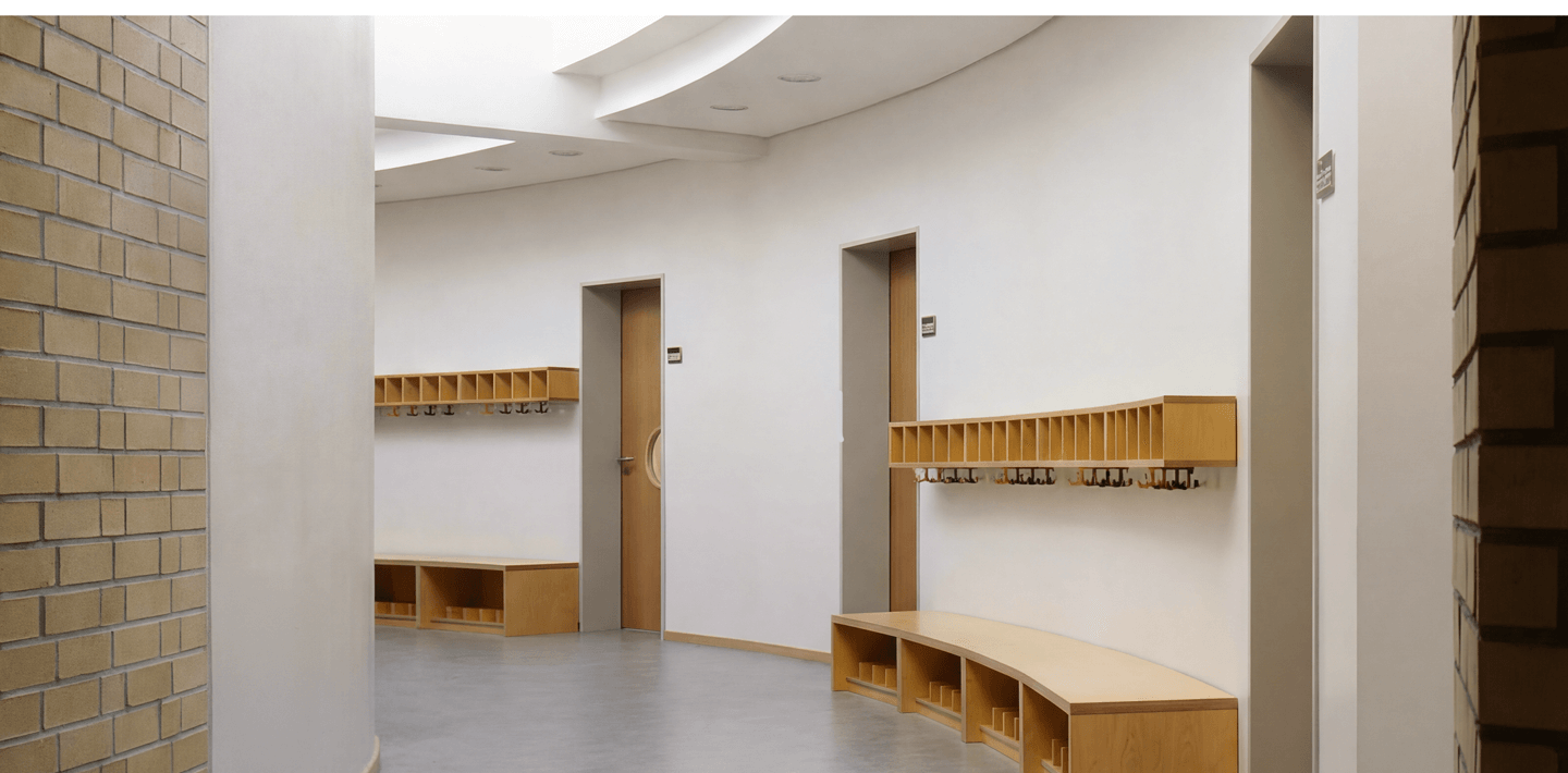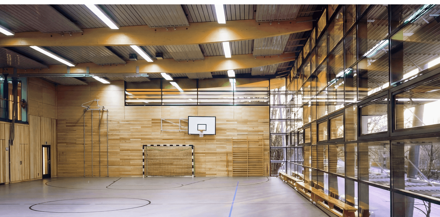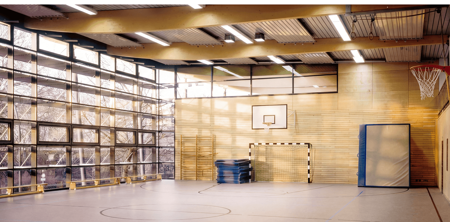 Die Sporthalle wurde so konzipiert, dass ihre beiden Hallenfelder übereinanderliegen. Diese kompakte Bauweise schafft Raum für einen großzügig nutzbaren Schulhof. Beide Hallen sind über eine Galerie einsehbar, die sich direkt an die Umkleidebereiche anschließt und von Besuchern genutzt werden kann.