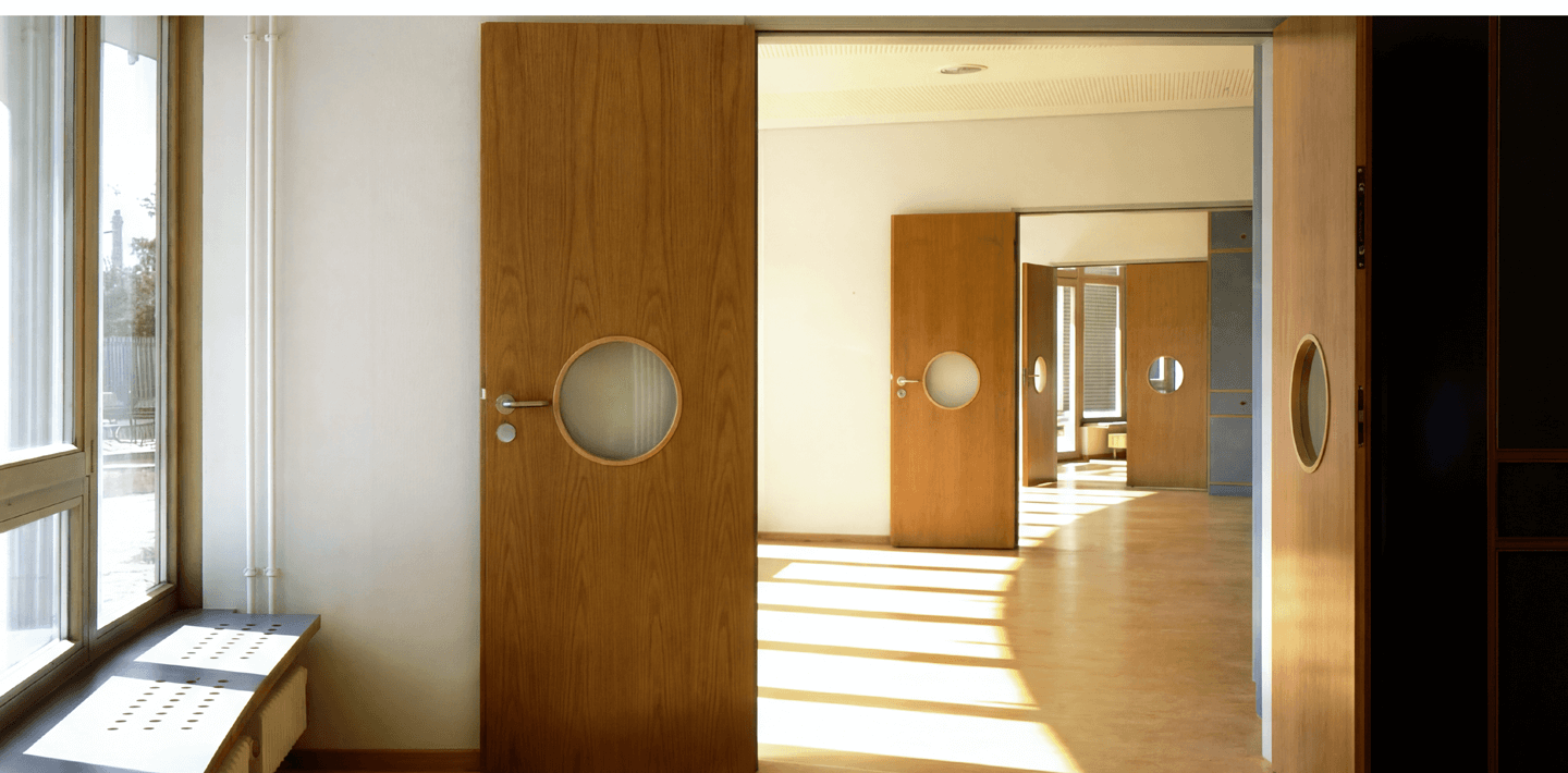 Auf dem Grundstück der Anne-Frank-Grundschule wurde eine zweigeschossige Kindertagesstätte sowie eine platzsparend organisierte Doppelsporthalle errichtet. Die Kita orientiert sich mit allen Gruppenräumen nach Süden zum Garten, wodurch helle, gut nutzbare Räume für unterschiedliche Altersgruppen entstehen. Das Obergeschoss verfügt zusätzlich über einen Balkon mit Außentreppe, der einen direkten Zugang ins Freie ermöglicht.