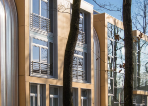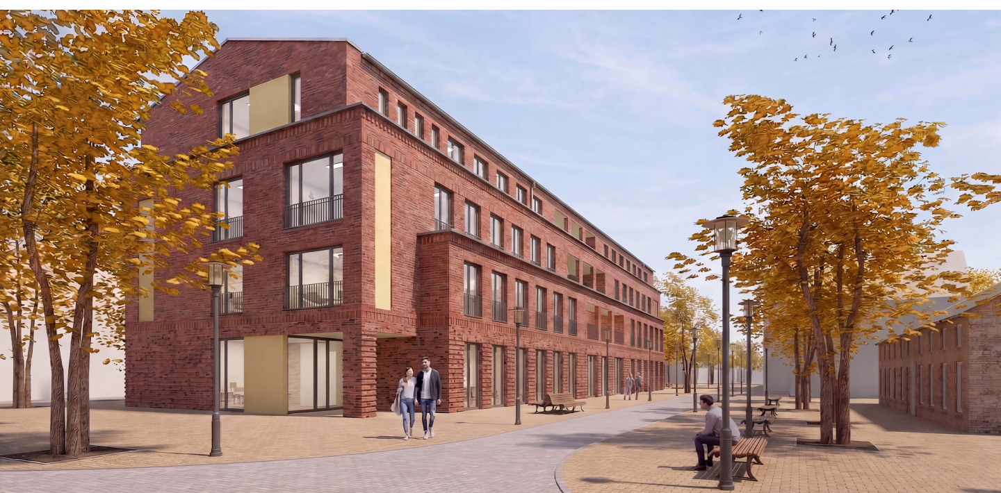 Der viergeschossige Neubau fügt sich durch Form und Material behutsam in die historische Gesamtanlage ein und stärkt das städtebauliche Gleichgewicht rund um das bestehende Verwaltungsgebäude. Das flach geneigte Satteldach orientiert sich an den Bestandsgebäuden.